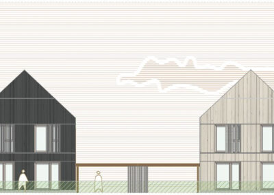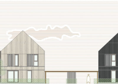 Die städtebauliche Setzung orientiert sich an einer klaren Ordnung entlang der Baugrenzen und bildet differenzierte Gartenräume mit unterschiedlichen Graden an Privatheit. Rück- und Vorsprünge in den Baukörpern schaffen zwei Hausgrößen und gliedern das Quartier maßstäblich. Eine vielfältige Dachlandschaft sowie die differenzierte Holzfassade verleihen dem Ensemble eine eigenständige Identität und ein harmonisches Gesamtbild.