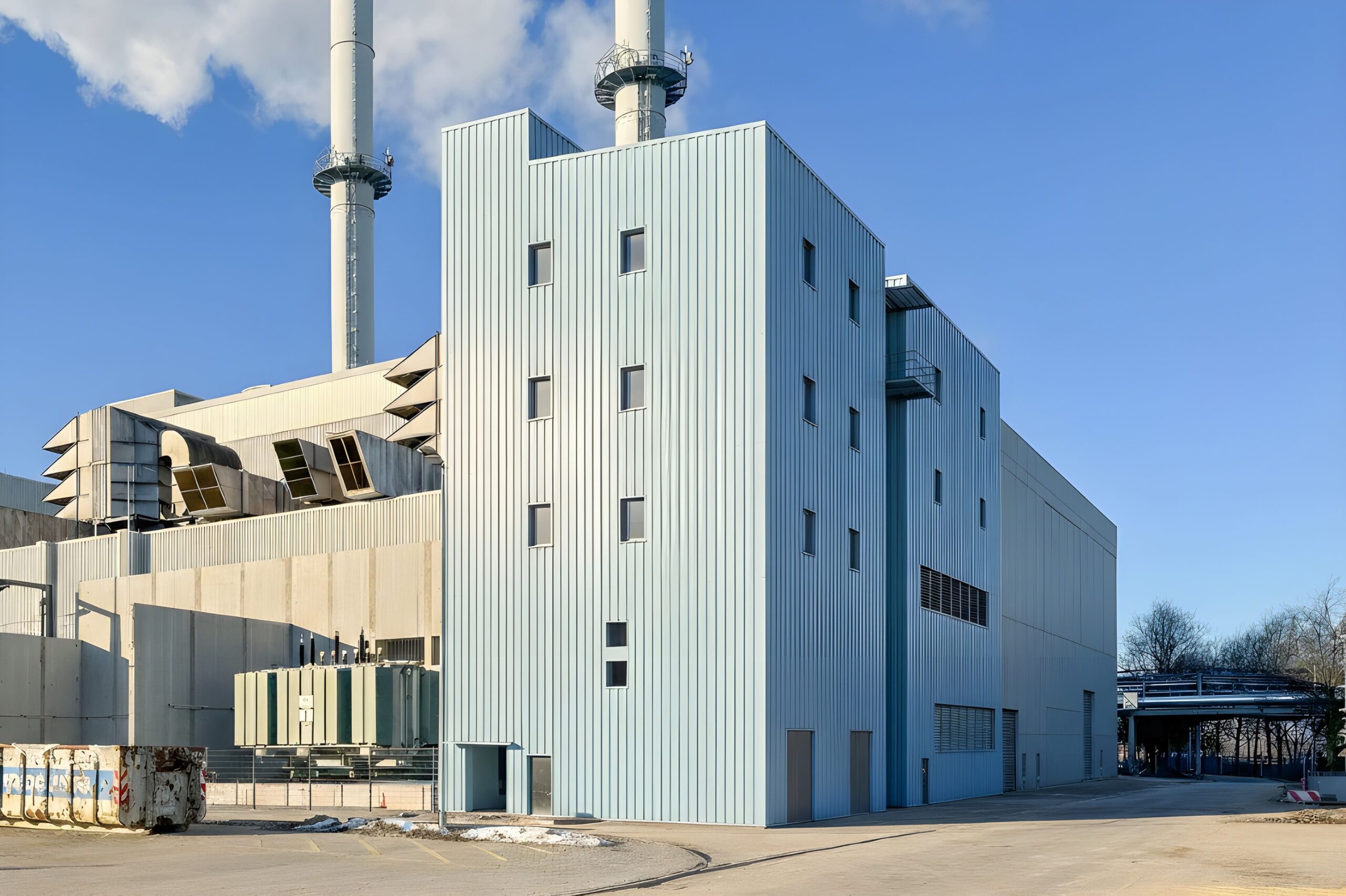 klare Volumen, präzise Fassaden aus metallischen Paneelen, funktionale Gliederung und eine nahtlose Integration in die bestehende Kraftwerksstruktur.